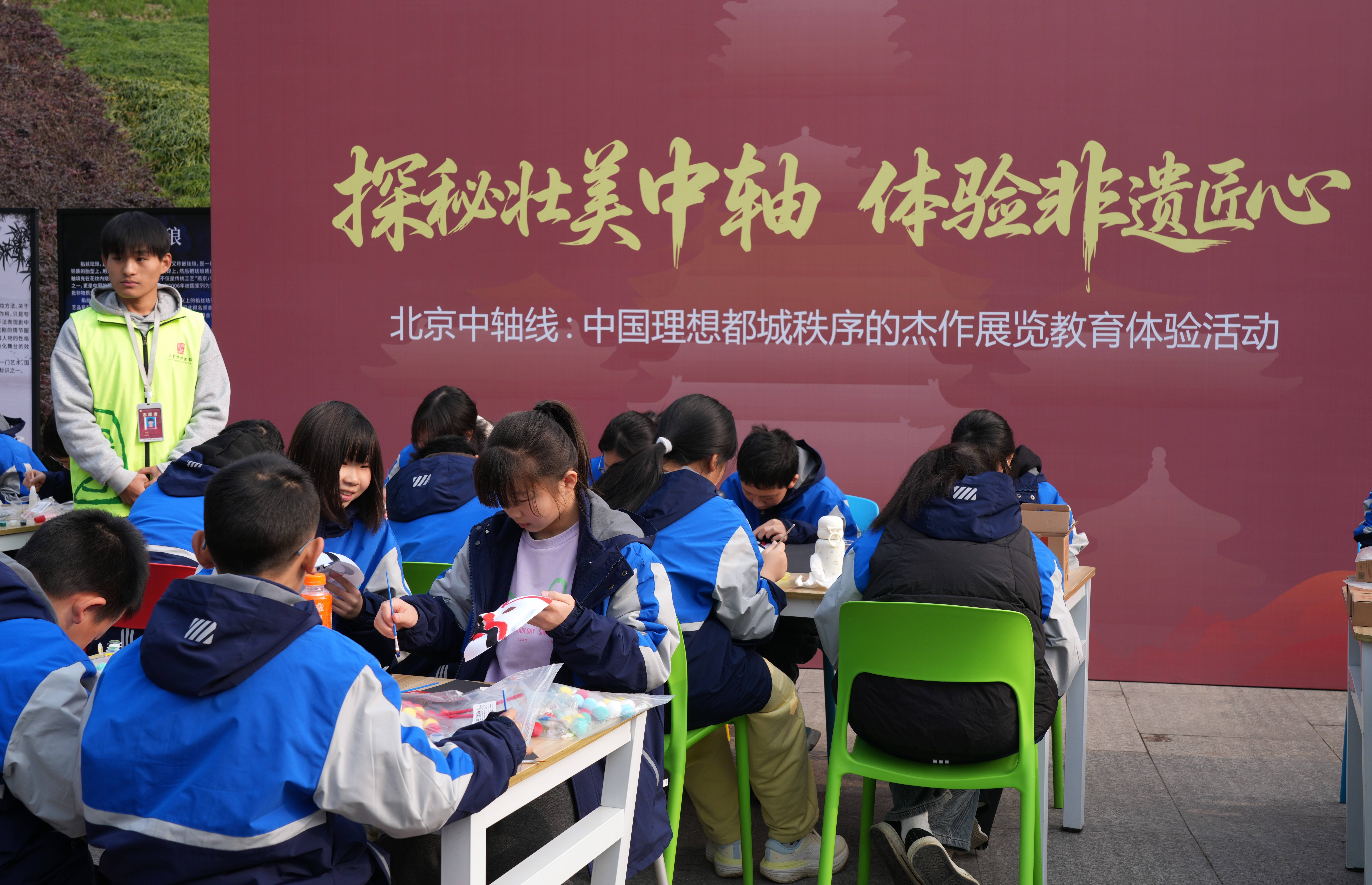 11月25日体育游戏app平台,学生在“北京中轴线:中国理思齐城秩序的极品”特展上体验北京非遗。新华社发