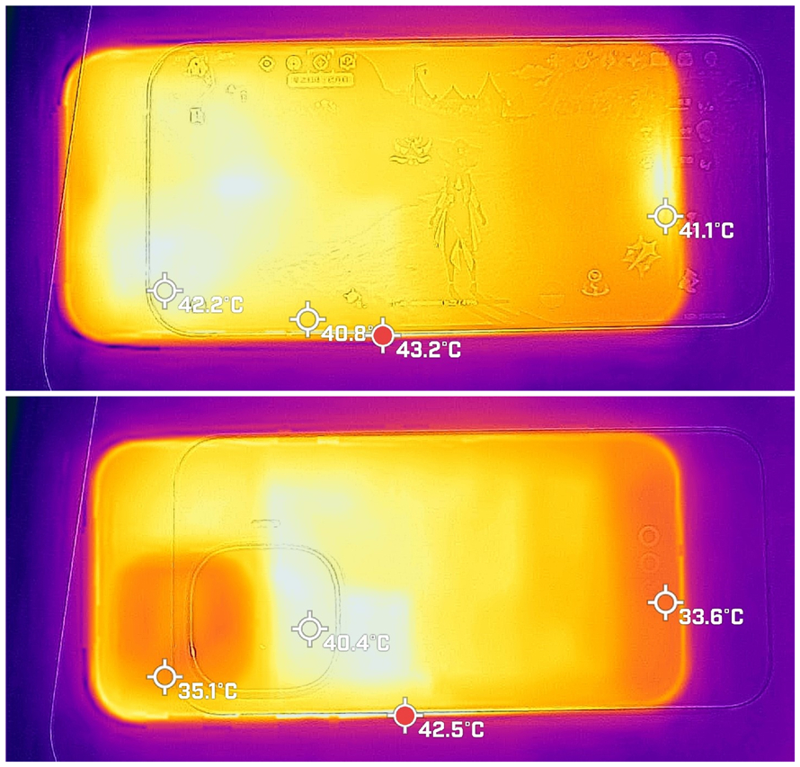 那发烧阐发若何呢?咱们使用红外测温仪进行测试,可以看笔直机温度最高如故在边框的位置,达到了43.2℃。