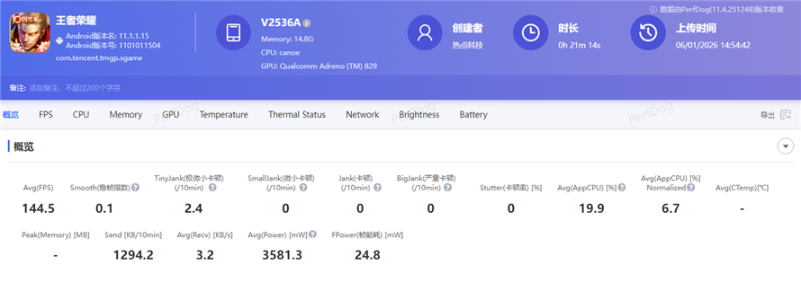 iQOO Z11 Turbo在《王者荣耀》中扶助144fps+极限画质档位,何况亦然通过KPL比赛用机测试认证。那咱们在144fps+极限画质下,进行测试,测得游戏的平均帧率可以达到144.5fps,平均功耗为3.58W,通过帧率图可以看到游戏全程莫得出现掉帧的情况。