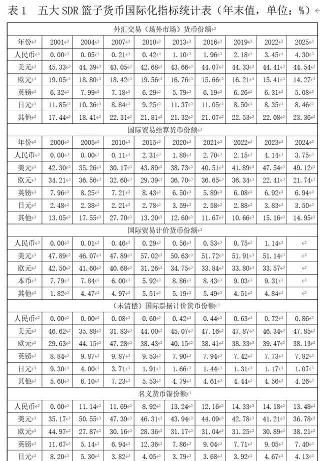 21世纪以来,国际货币口头呈现出多元化倾向。如表1所示,从除五大相称支款权(SDR)货币除外的其他货币总体份额变化不错看出,2000年以来,除国际单子计价运筹帷幄外,其他所缱绻均线路国际货币口头的多元化趋势特征。具体来看,其他货币的外汇交往货币份额由2002年的17.44%擢升至2025年的23.36%,国际买卖结算货币份额、外汇储备货币份额分别由2000年的13.05%和1.75%上涨至2024年的14.95%和9.65%;国际买卖计价货币份额中的本币计价和其他货币计价比重则分别由2000年的7.79%和1.82%擢升至2023年的9.31%和4.84%。上述变化表表示了国际货币口头的多元化趋势。