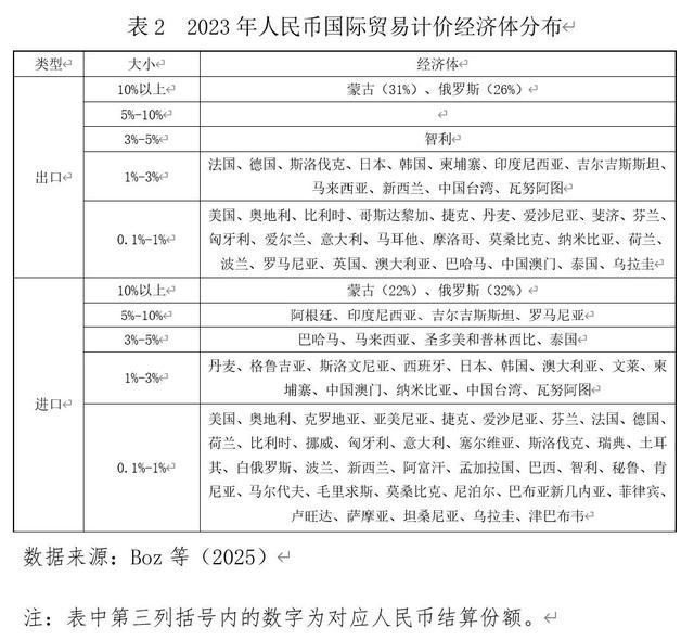 第二,东说念主民币计价全体呈区域性散漫特质,在东亚东南亚等相近地区、欧盟、南好意思和部分非洲国度,东说念主民币运转贯通计价货币作用(表2)。Boz等(2025)的统计数据线路,2023年,惟有67个经济体东说念主民币相差口计价份额杰出0.1%,其中,杰出1%、3%、5%、10%的分别惟有51个、11个、6个和2个(俄罗斯和蒙古国)。从地别离散来看,位居中国相近地区的经济体份额相对较高,其他地区如欧盟等份额相对较小。该斥逐标明:一方面,东说念主民币计价能力存在着区域性多点散漫特质,尚不具备环球性特征,相较好意思元在除欧盟之外的环球主要经济体占主导和欧元在欧盟占主导还有显豁差距;另一方面,共建“一带沿途”倡议和《区域全面经济伙伴联系协定》(RCEP)的签署对激动东说念主民币计价能力贯通着蹙迫作用,中国相近地区,尤其是东亚、东南亚全体名次较高。