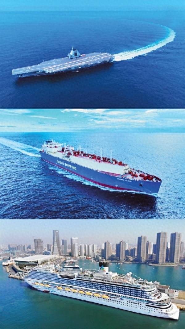我国已具备建造航空母舰、大型液化自然气运载船、大型邮轮的智商,攻克了造船工业王冠上的“三大明珠”。上图为2024年5月7日在首航试验中的我国第一艘国产电磁弹射航母福建舰(新华社发 丁子羽/摄)。中图为2025年12月19日在上海录用的中国首艘应用国产殷瓦钢的大型LNG船“远海绿洲”号(中船沪东中华 张良/摄)。下图为2025年4月6日靠泊青岛国际邮轮母港的首艘国产大型邮轮“爱达·魔都号”(新华社记者 李紫恒/摄)。