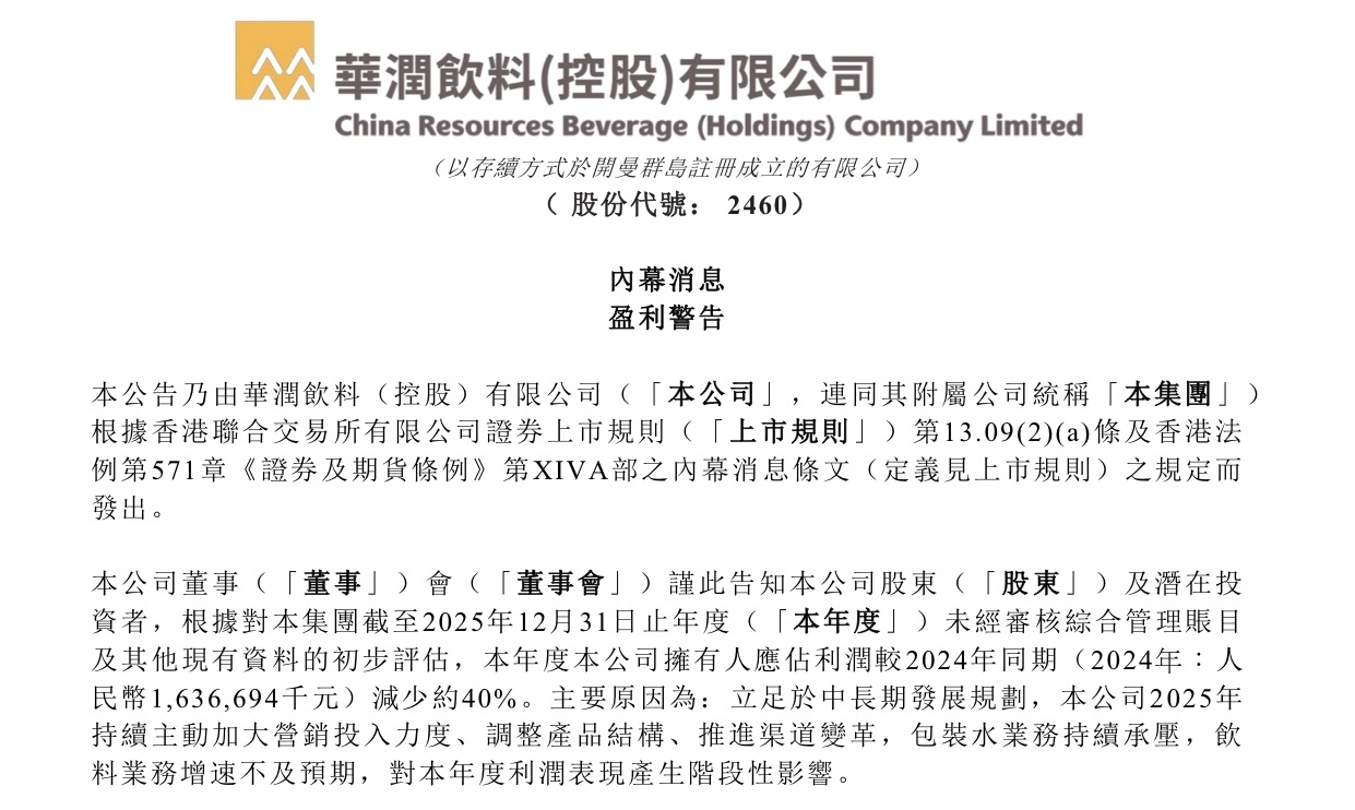 日前,华润饮料(怡宝母公司)发布盈利预警,瞻望2025年度公司领有东谈主应占利润同比减少约40%。这家上市仅一年的饮品巨头,净利润将从2024年的16.37亿元暴减至约9.8亿元。