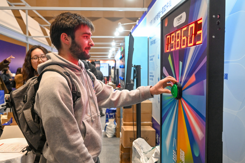 3月27日,上海西岸海外会展中心,别称异邦不雅众在体验测试响应力的小游戏。滂沱新闻记者 朱伟辉 图