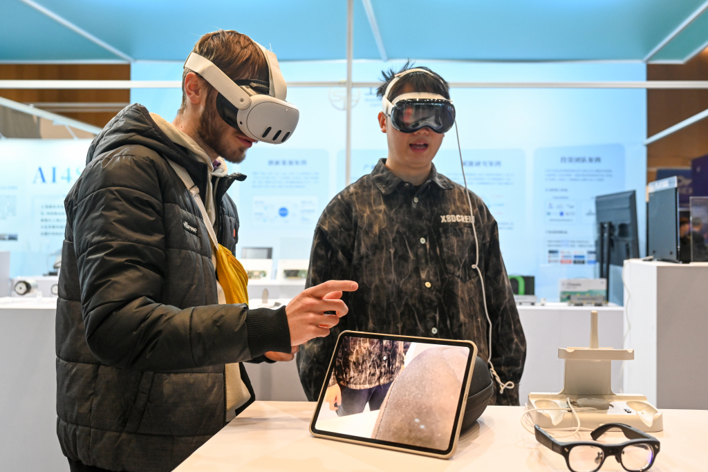 3月27日,上海西岸海外会展中心,异邦不雅众在责任主说念主员指挥下体验智能眼镜。滂沱新闻记者 朱伟辉 图