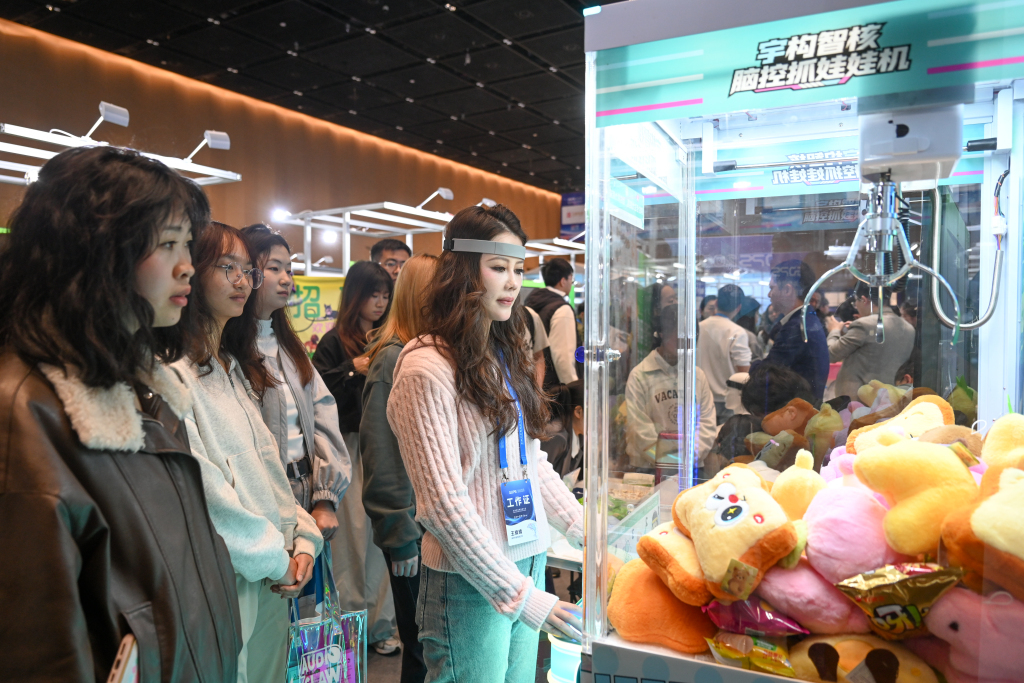 3月28日,上海西岸海外会展中心,一台脑控娃娃机前排起长龙。据责任主说念主员先容,体验者所戴的头环会收罗大脑“醒目力信号”并传递给机器,当指导者醒目力越勾通,娃娃机持夹的持力越大。滂沱新闻记者 朱伟辉 图
