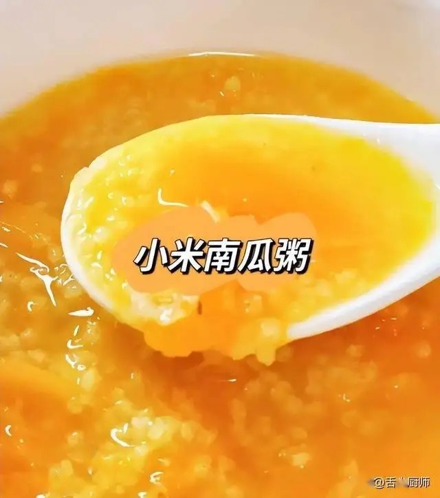 6. 用勺子将南瓜压成泥状,与小米粥充分会通,使粥愈加浓稠香甜。