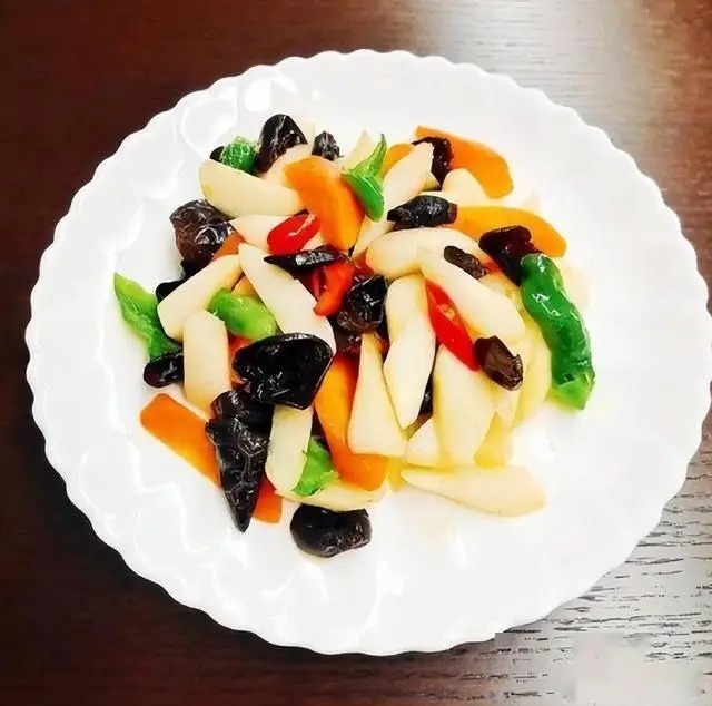6. 加入青椒块翻炒几下,再放入焯好水的木耳、山药片和胡萝卜片,不息翻炒均匀。