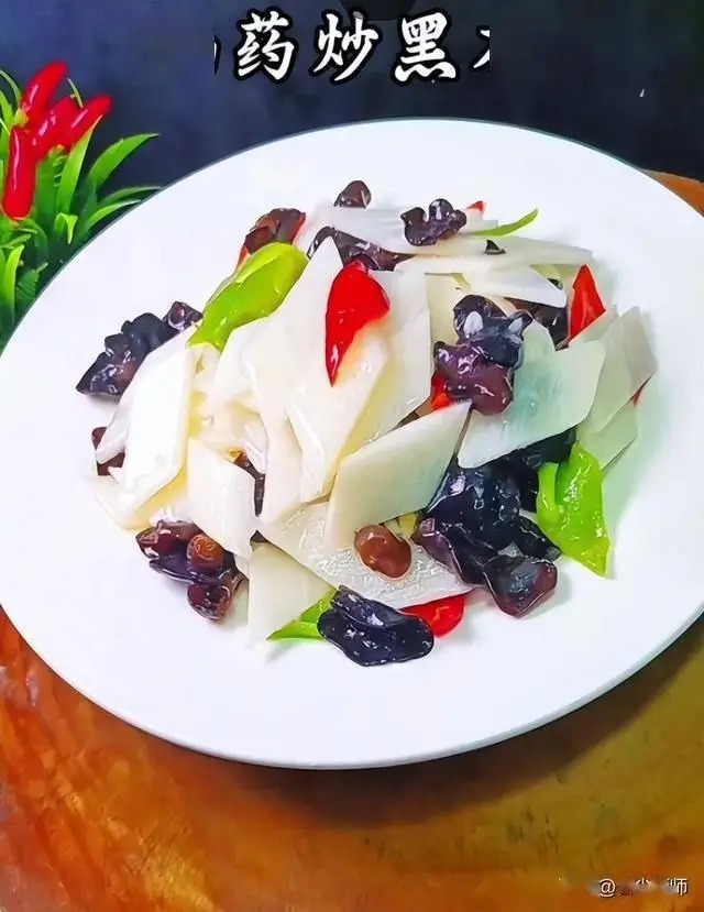 所需食材:山药1根、木耳1把、胡萝卜半根、青椒1个、大蒜2瓣、盐适量、鸡精极少、食用油适量。